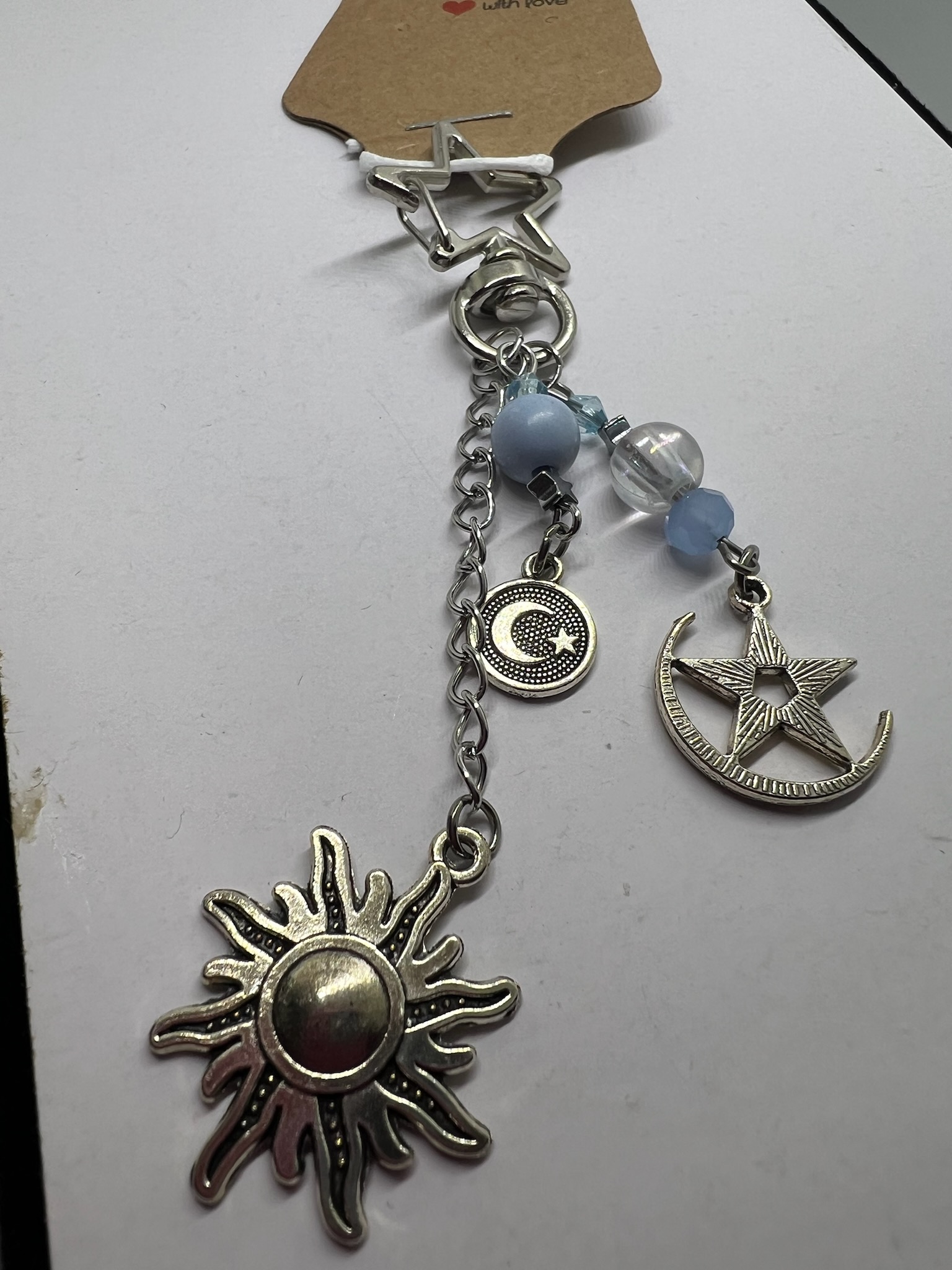Adorn your bag with this celestial-themed keychain. Featuring a sun, moon, and star charms, along with delicate blue and clear beads, this silver-tone keychain adds a touch of whimsy to any accessory. Made of mixed metals and glass beads, attach it to your purse for a personalized flair.