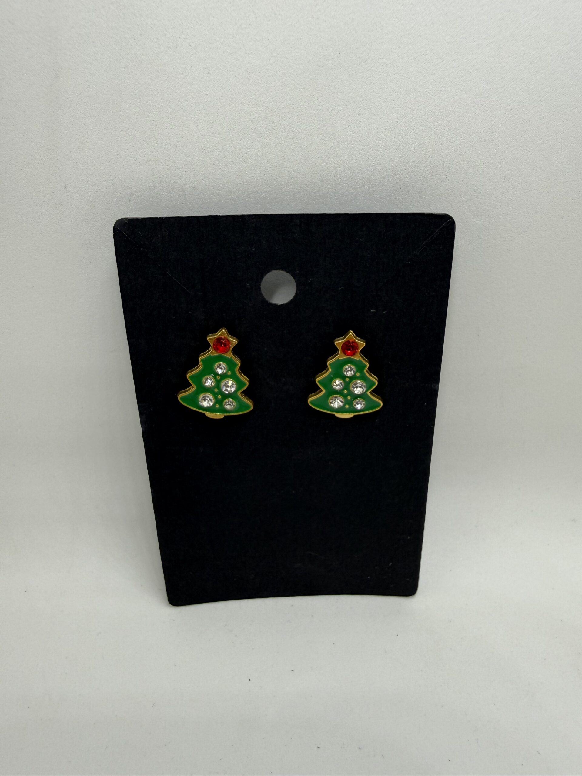 Festive Christmas tree earrings with green enamel and rhinestones.