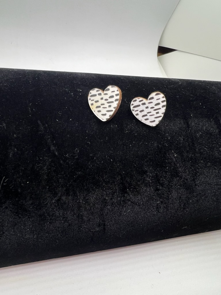 Dalmatian print heart stud earrings made of wood.