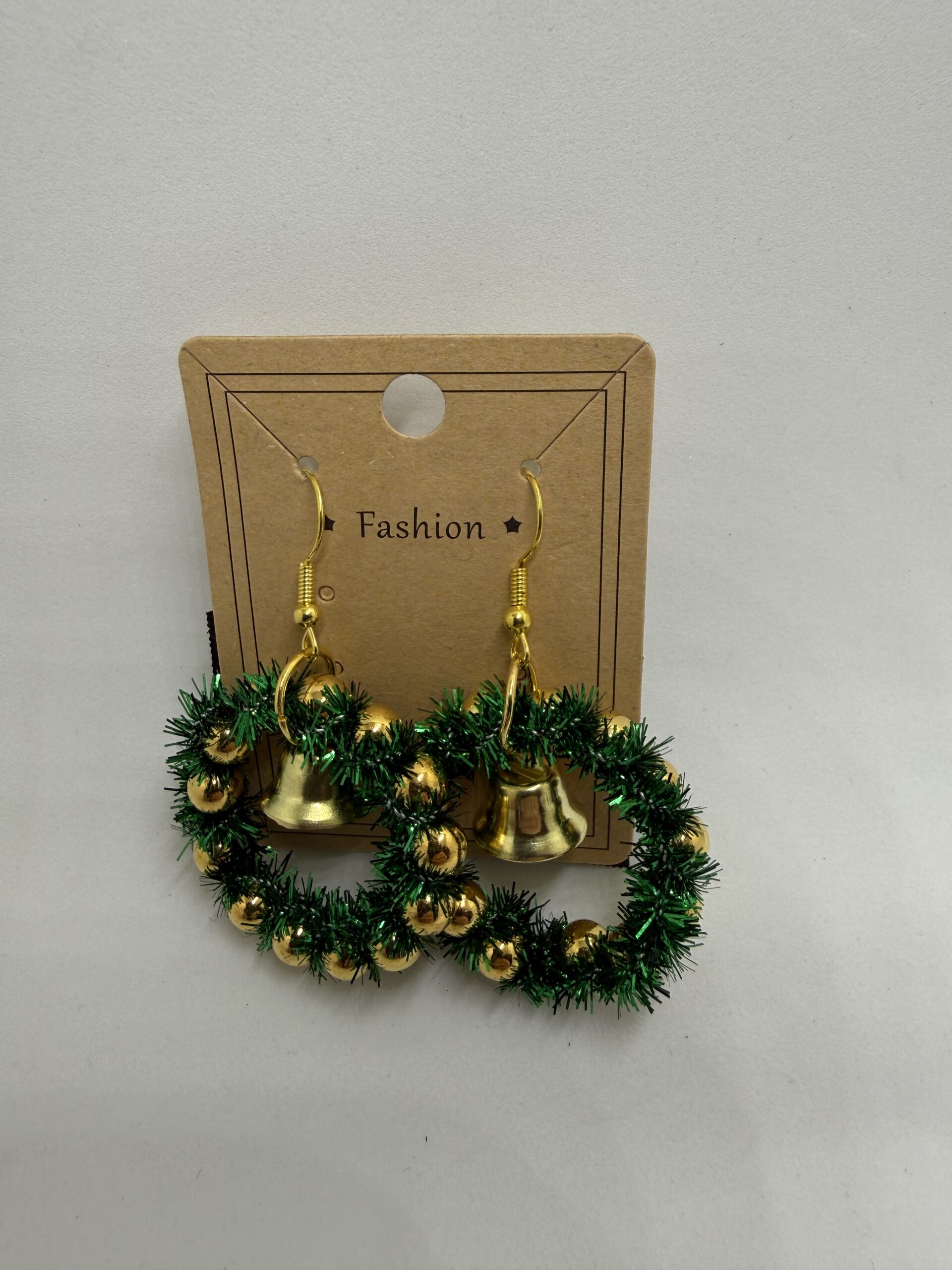 These charming earrings feature a miniature golden bell and a green tinsel wreath. Made with gold-tone metal and tinsel, these earrings are perfect for adding a touch of holiday cheer to any outfit. Wear them to your next holiday party or give them as a gift.
