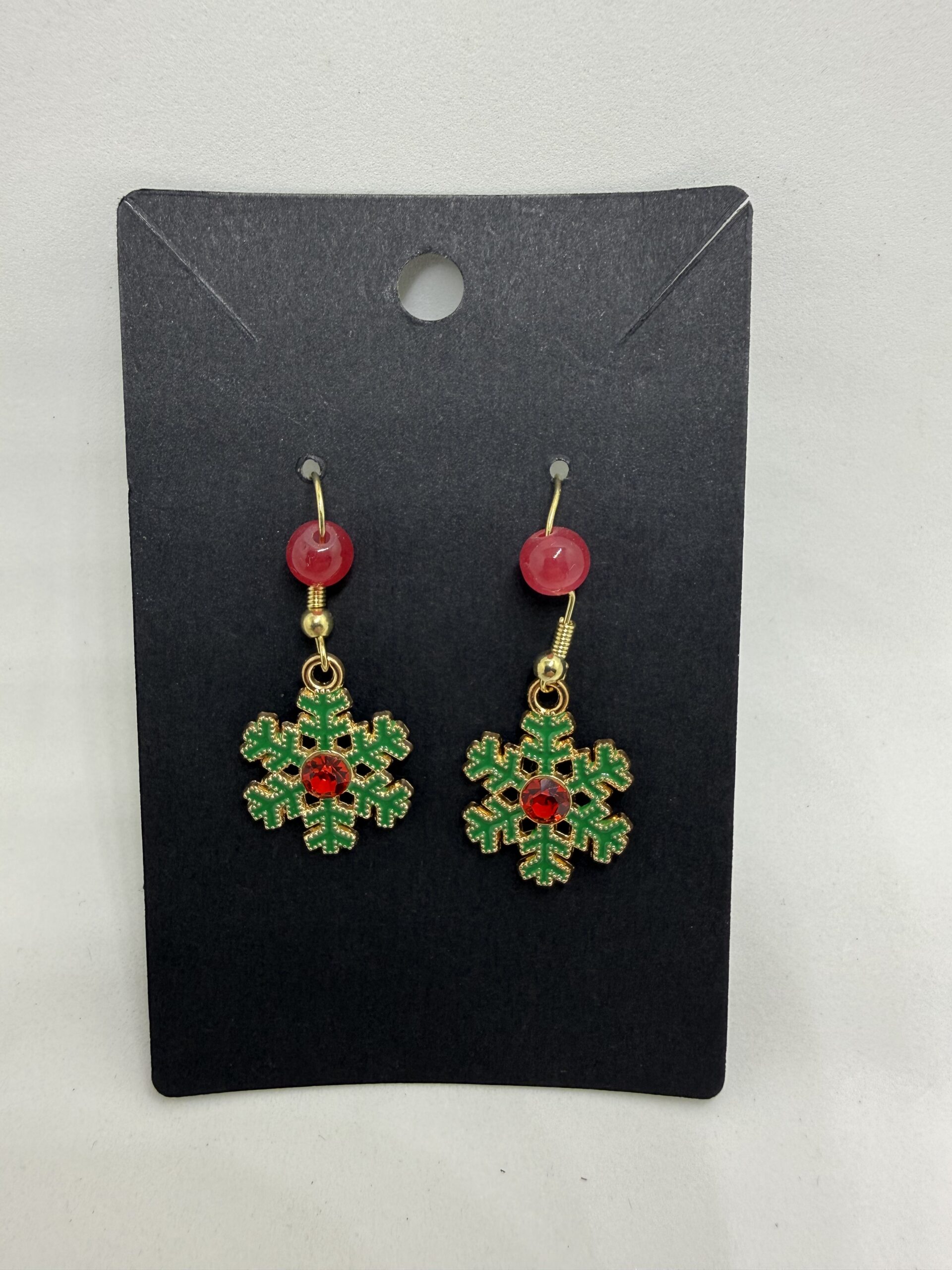 These festive snowflake earrings feature a green and gold snowflake with a red gem center. The earrings dangle elegantly and are perfect for adding a touch of holiday cheer to any outfit. Made with alloy and acrylic, these earrings are lightweight and comfortable to wear during holiday gatherings.
