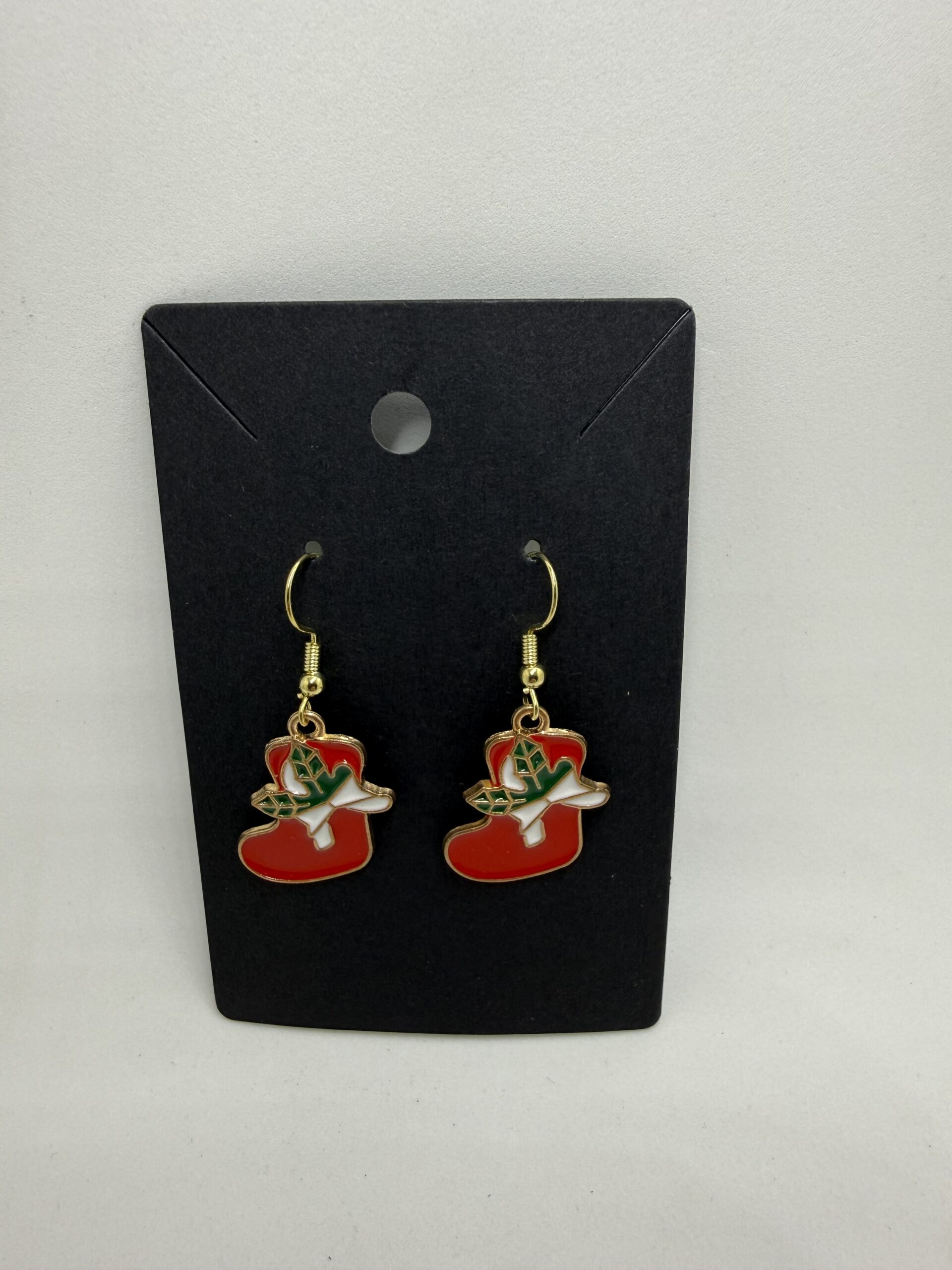 Festive stocking earrings for holiday cheer.