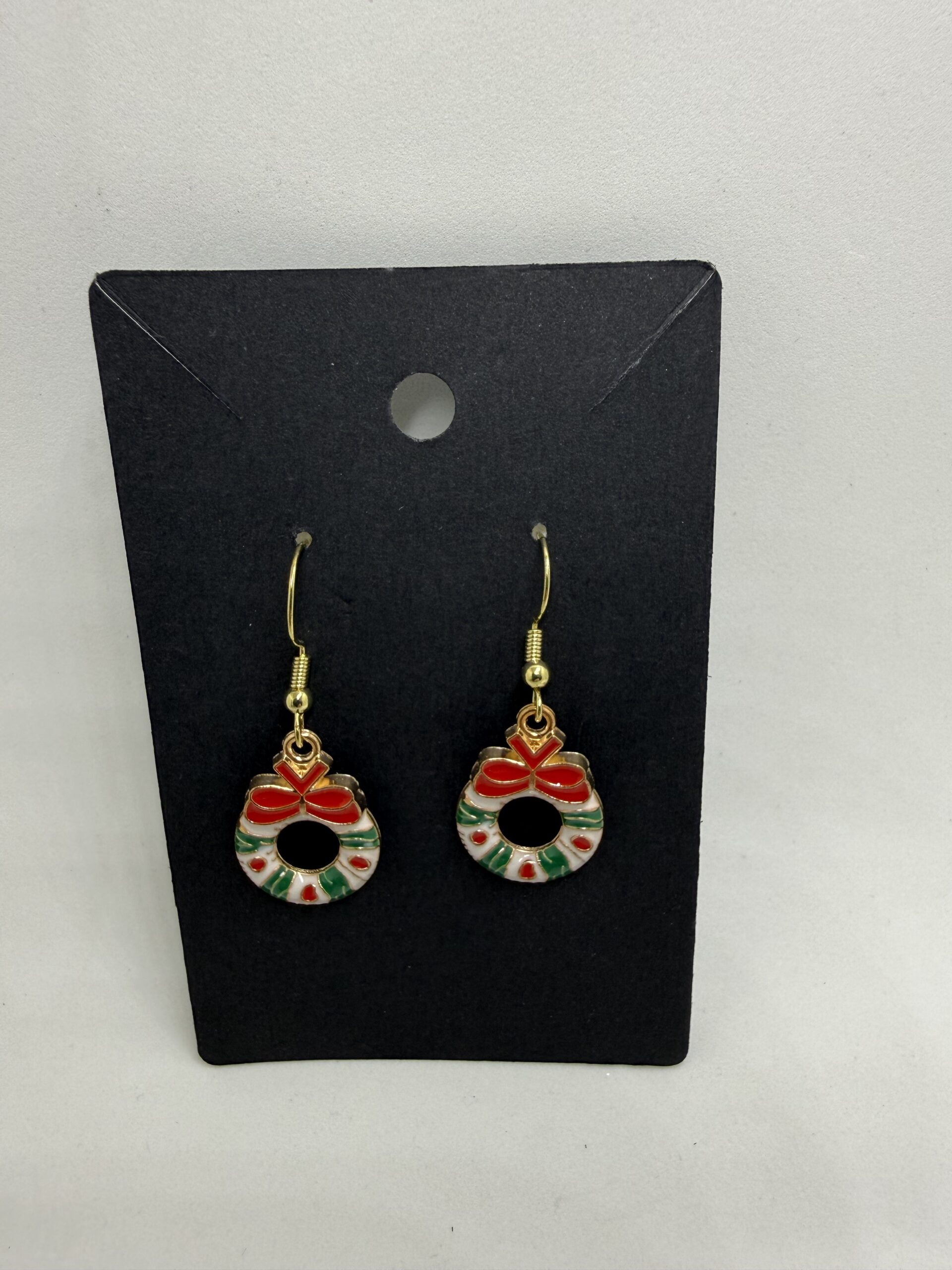 These festive wreath earrings bring holiday cheer to any outfit. Made with gold plated metal and colorful enamel, they’re perfect for adding a touch of seasonal sparkle to your holiday gatherings. Wear them to your next Christmas party or gift them to a loved one.