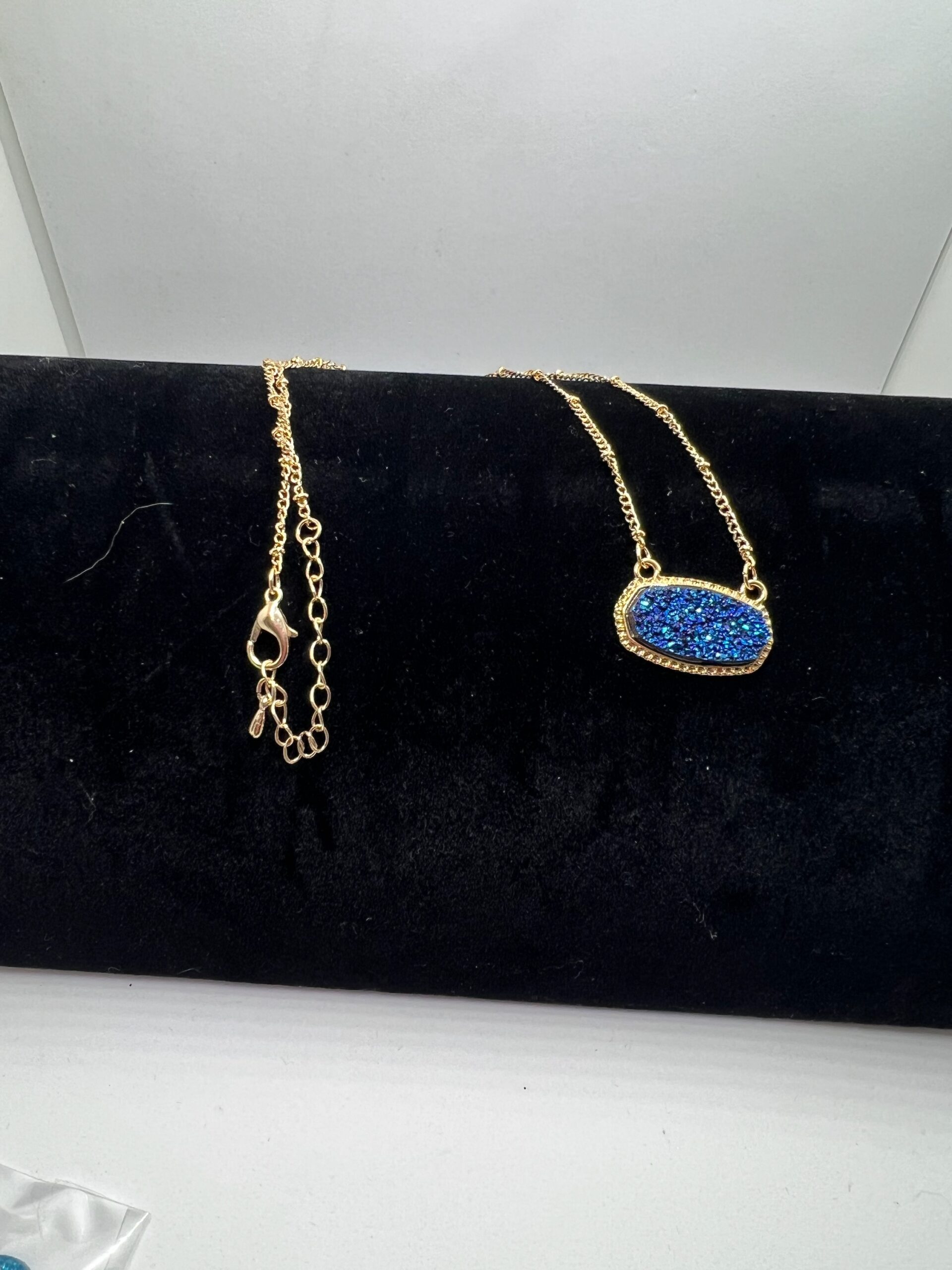 This beautiful gold chain necklace features a stunning blue druzy pendant, adding a touch of sparkle to any outfit. The necklace is made of high-quality materials that are both durable and stylish. Wear this necklace to dress up a casual outfit or add the final touch to a special occasion look.