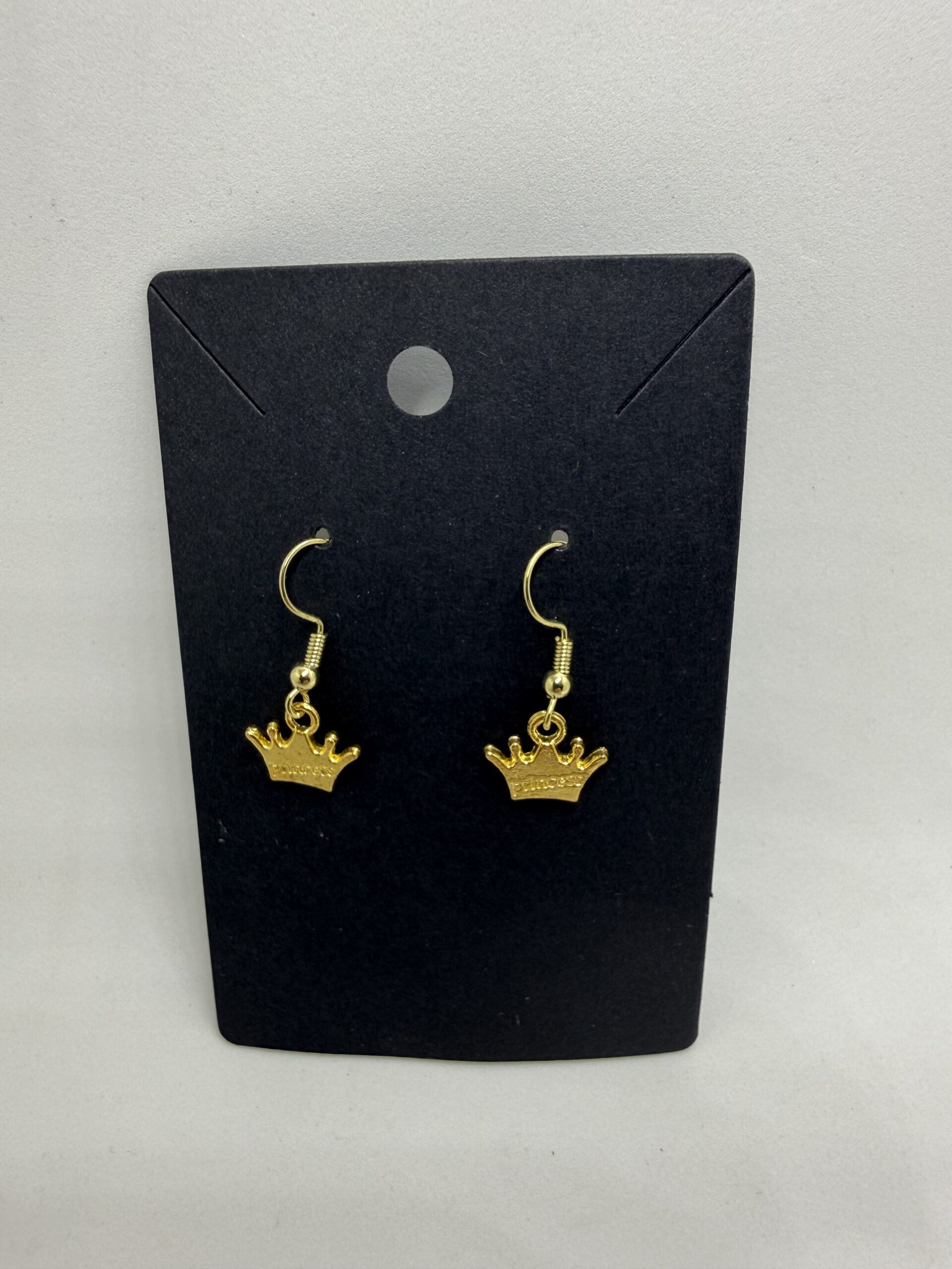 Gold crown earrings for a royal, elegant look.