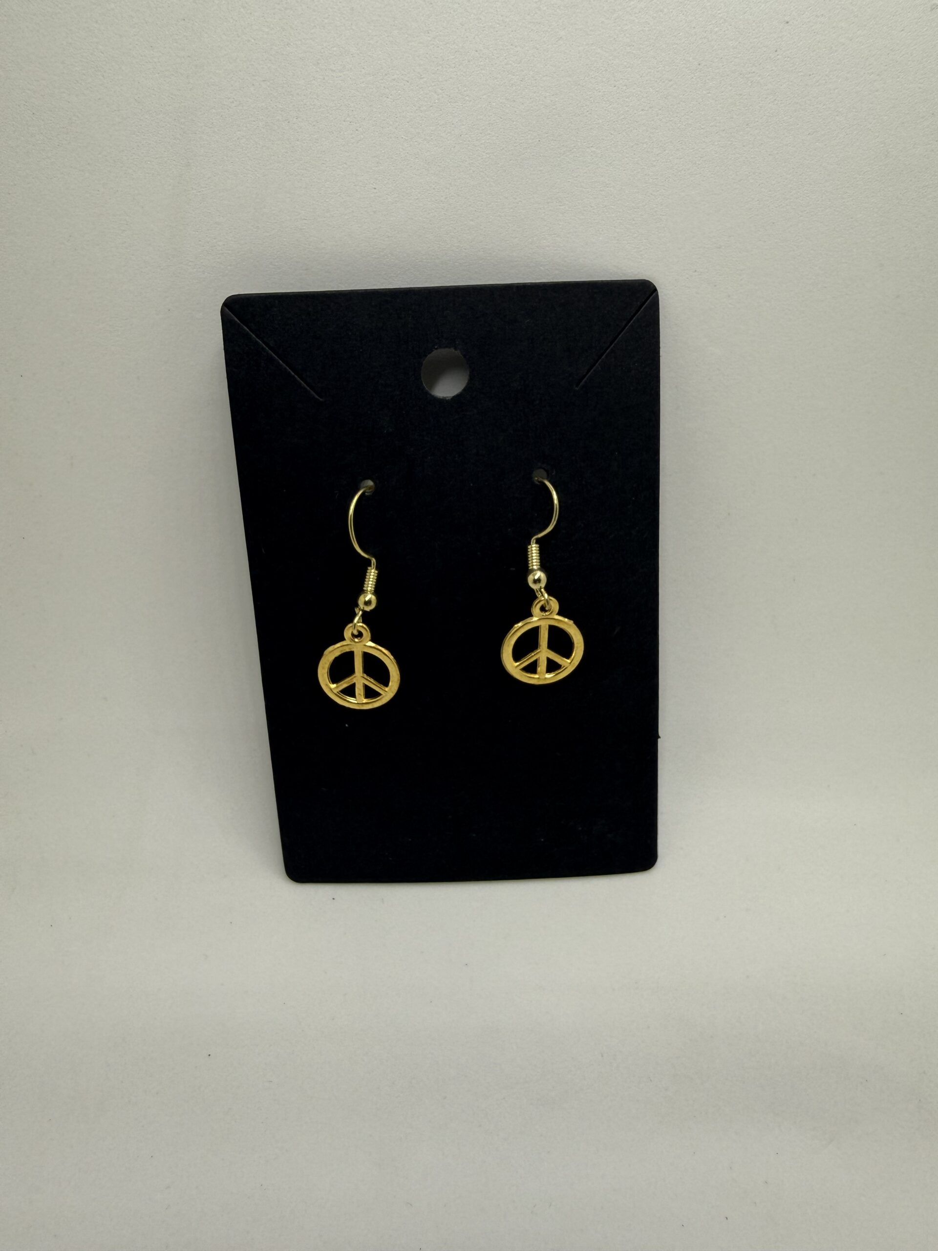 Gold peace sign earrings add retro style.