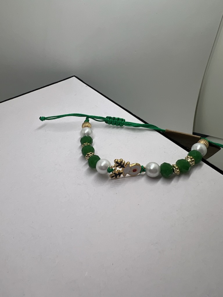 This festive bracelet features green and pearl beads, accented with a charming reindeer charm. The adjustable green cord ensures a comfortable fit, making it perfect for adding a touch of holiday cheer to any outfit. Wear it to your next holiday party or give it as a thoughtful gift.