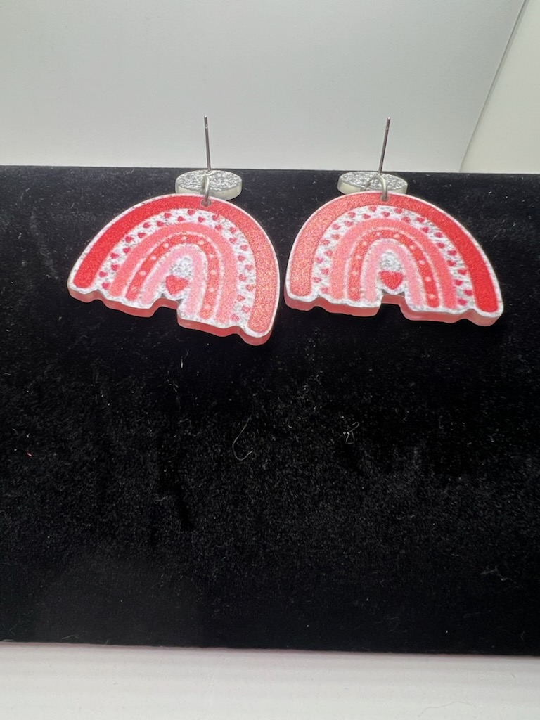 Acrylic heart rainbow dangle earrings for Valentine’s Day.