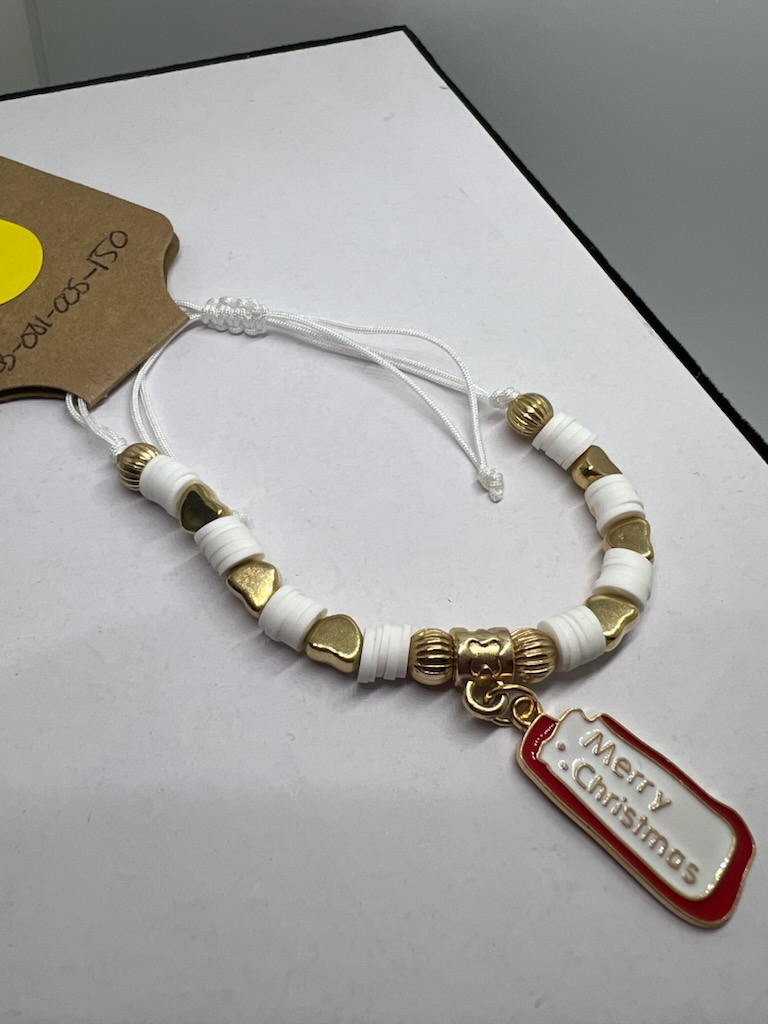 Festive ‘Merry Christmas’ bracelet with white and gold beads.