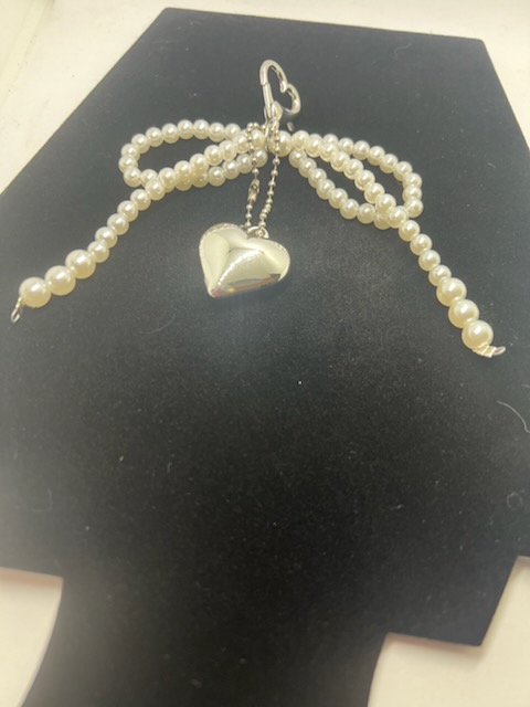This charming keychain features a delicate pearl bow and a silver heart charm. Made with faux pearls and a durable metal clasp, it adds a touch of elegance to your purse or keys. Use it to accessorize your handbag or as a thoughtful gift for a loved one.