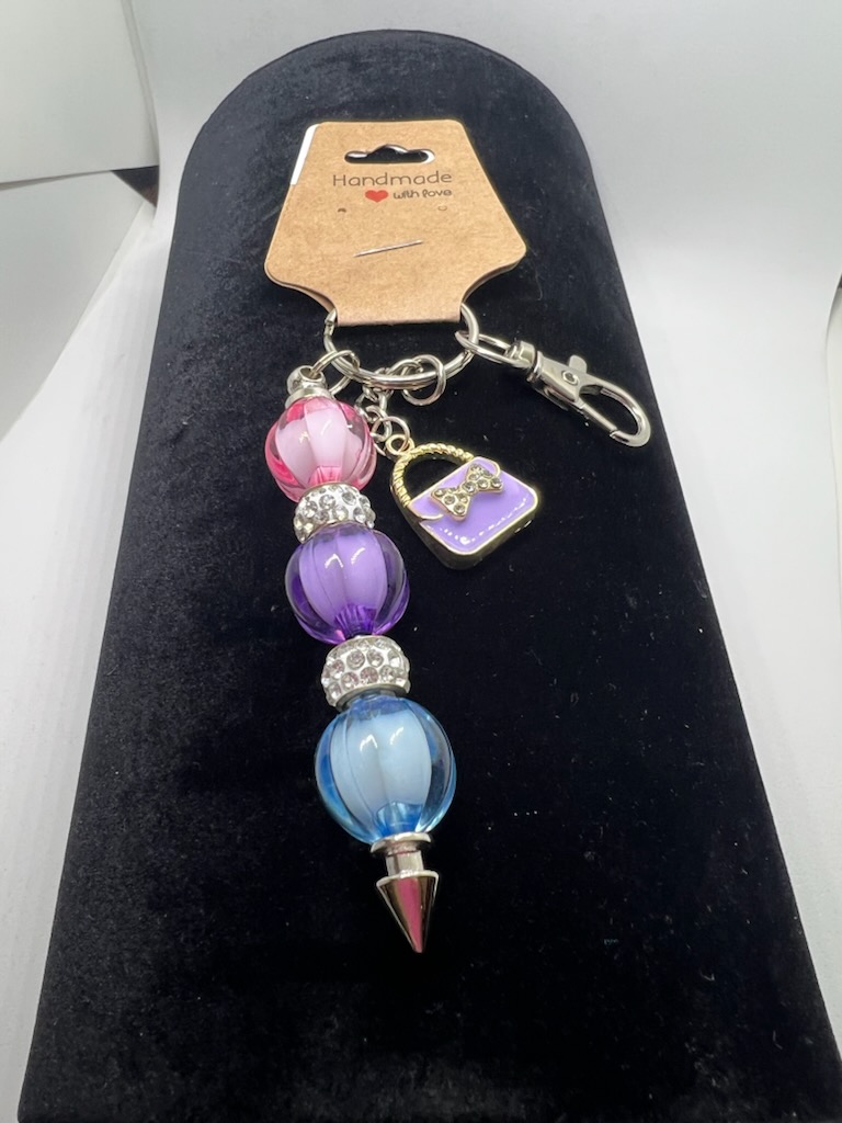 This unique keychain features pink, purple, and blue beads with rhinestone accents and a cute purse charm. Made with durable materials, it adds a touch of whimsy to your keys or bag. Use it to easily identify your belongings while showcasing your personal style.