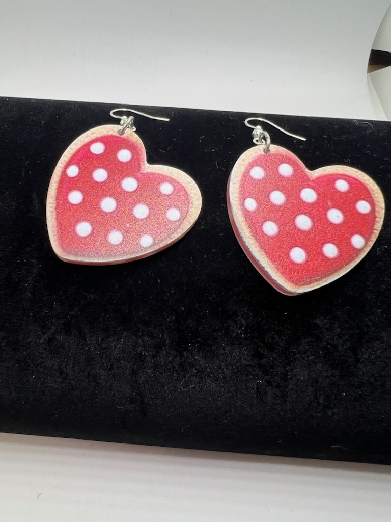These adorable heart-shaped earrings feature a playful red polka dot design, perfect for adding a touch of whimsy to any outfit. Made from lightweight material, they are comfortable to wear all day long. Ideal for Valentine’s Day or a fun everyday look.