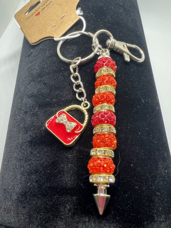 Add a touch of sparkle to your everyday essentials with this charming keychain. Featuring red rhinestone beads and a cute purse charm, it’s perfect for adding flair to your keys or handbag. Made with durable materials, this keychain is both stylish and functional.