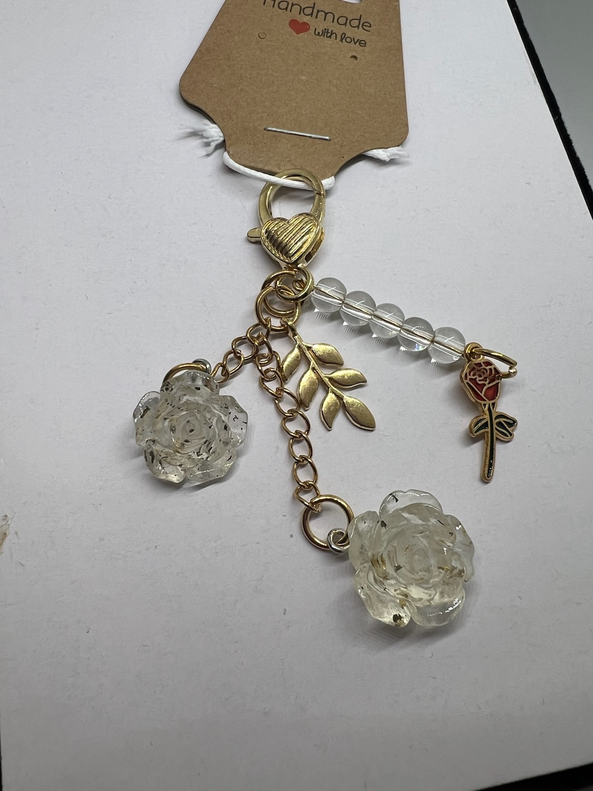 This beautiful keychain features delicate rose charms and gold leaf accents, adding a touch of elegance to your everyday essentials. Made with clear resin roses and gold-plated hardware, it’s perfect for adding a personal touch to your purse or keys. Use it to easily identify your keys or as a stylish accessory for your handbag.