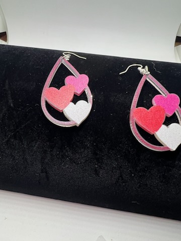 Teardrop earrings with pink, red, and white hearts.